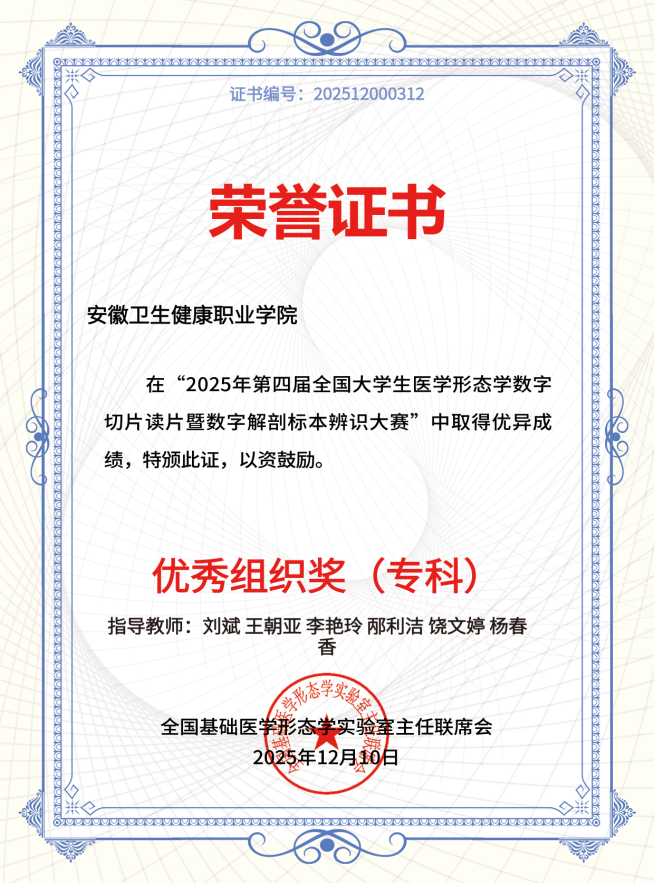12月7日,由全国基础医学形态学实验室主任联席会主办的“2025年第四届全国大学生医学形态学数字切片读片暨数字解剖标本辨识大赛”线上决赛圆满落幕,我院荣获优秀组织奖。